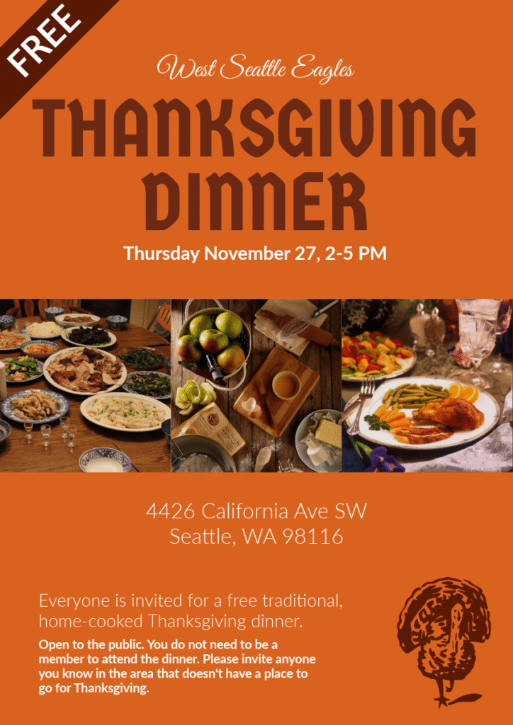 Dinner will be served from 2pm until 5pm. Donations are gladly accepted but this meal is free to everyone. Please invite anyone you know in the area that doesn’t have a place to go for Thanksgiving. Families and groups welcome.